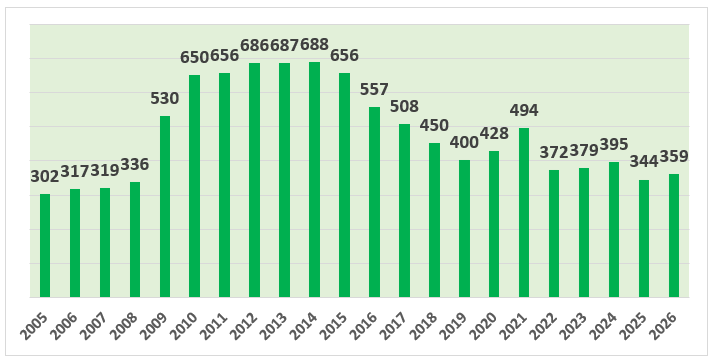 Gràfic 2: Sèrie històrica del volum de persones aturades per un mes de març