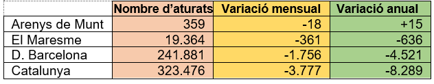 Pel que fa al Maresme l’atur ha augmentat a 12 municipis, ha baixat a 18 i s’ha mantingut a Alella. El descens més important s’han donat a Mataró (-100); els augments han estat poc significatius essent el més elevat a Argentona (+10 persones).