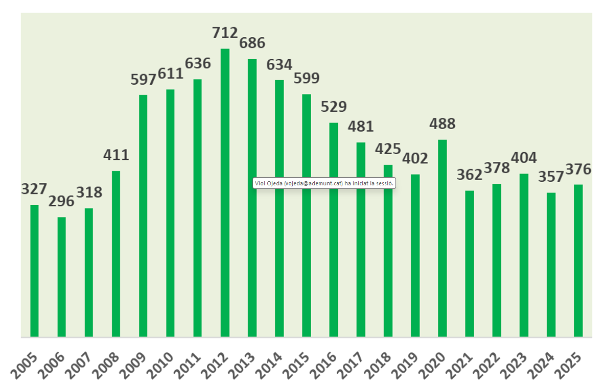 Pel que fa a la variació interanual ens trobem amb la dada negativa de que hi ha 19 persones a l’atur més que al novembre de 2024.