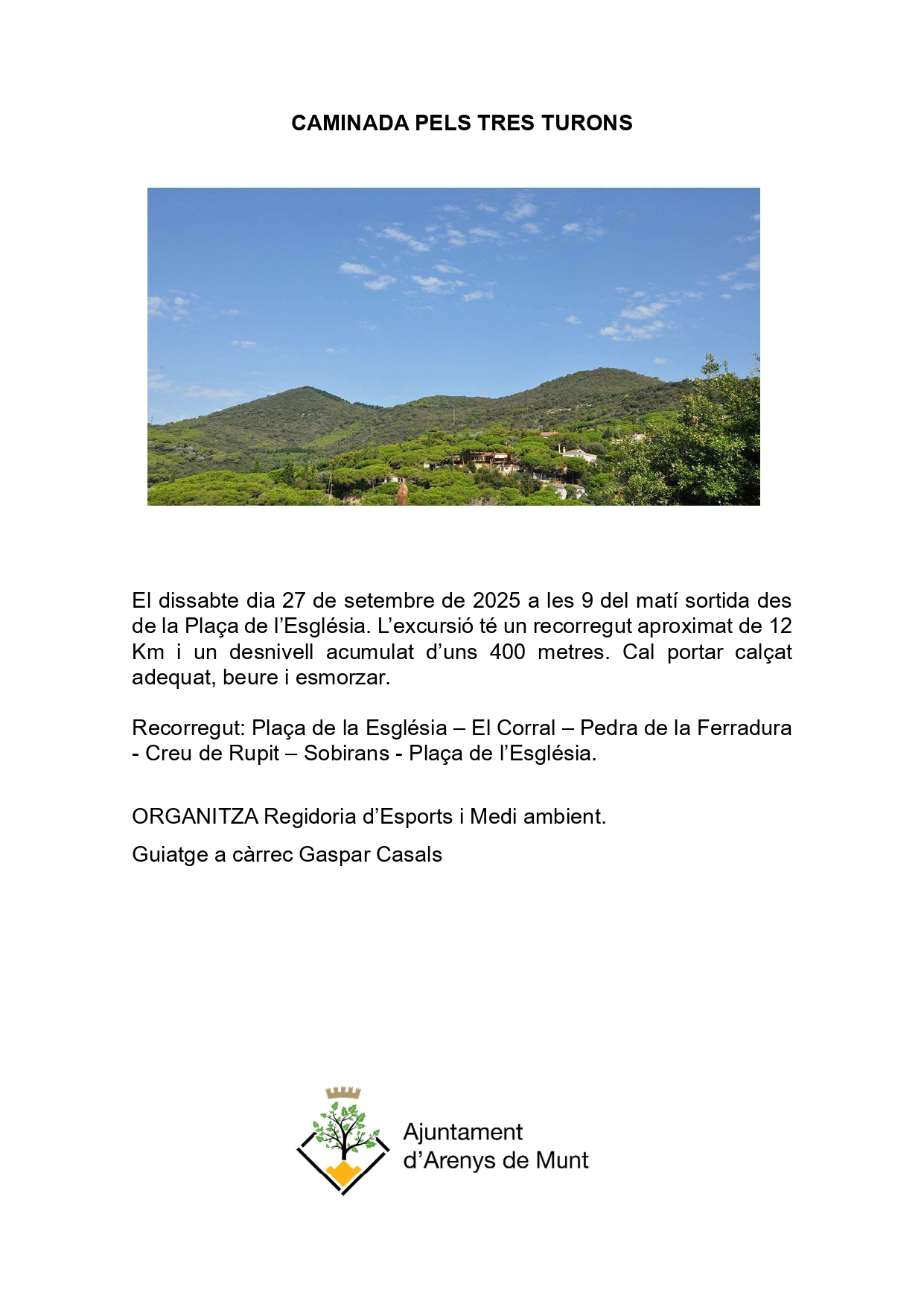 El dissabte dia 27 de setembre de 2025 a les 9 del matí sortida des de la Plaça de l’Església. L’excursió té un recorregut aproximat de 12 Km i un desnivell acumulat d’uns 400 metres. Cal portar calçat adequat, beure i esmorzar.