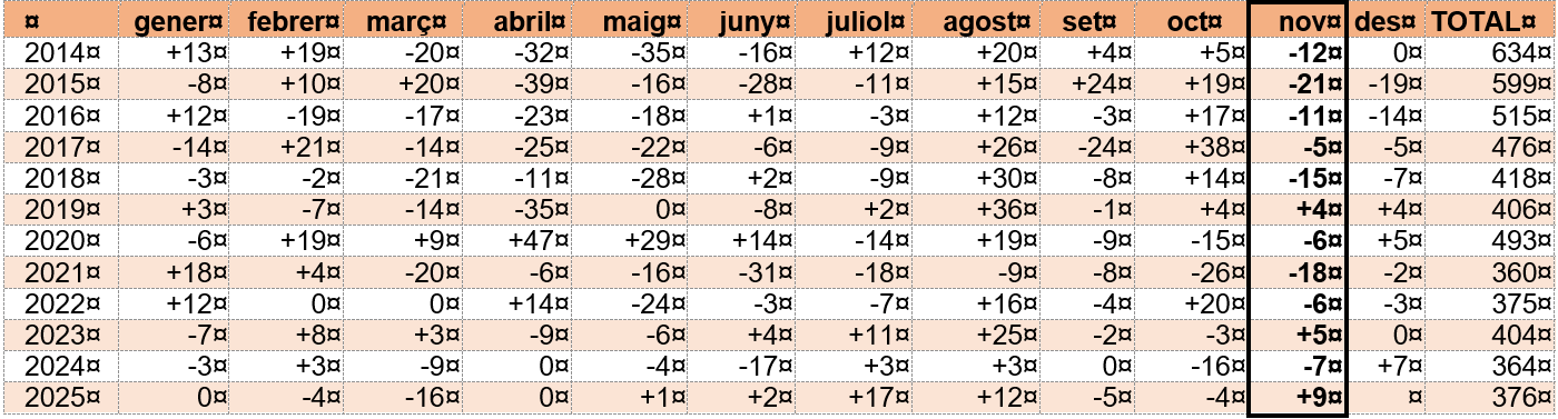 Pel que fa a la variació interanual ens trobem amb la dada negativa de que hi ha 19 persones a l’atur més que al novembre de 2024.